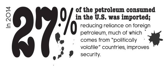 In 2014, about 27% of the petroleum consumed in the U.S. was imported; reducing reliance on foreign petroleum, much of which comes from “politically volatile” countries, improves security, the agency says.