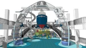 Plus, if you watch closely towards the middle of the above video, you can watch the beginning of the Port exhibit’s blue, fully operating gantry crane and massive ship hull beginning to be constructed!