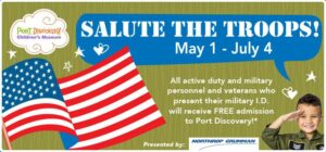 Thank you to all those who serve! From May 1 through July 4, veterans and active military receive free admission to Port Discovery, and service members will receive $2.00 off general admission for their guests. Simply present a valid military ID or valid discharge papers to enjoy a day of fun and learning at Port Discovery!