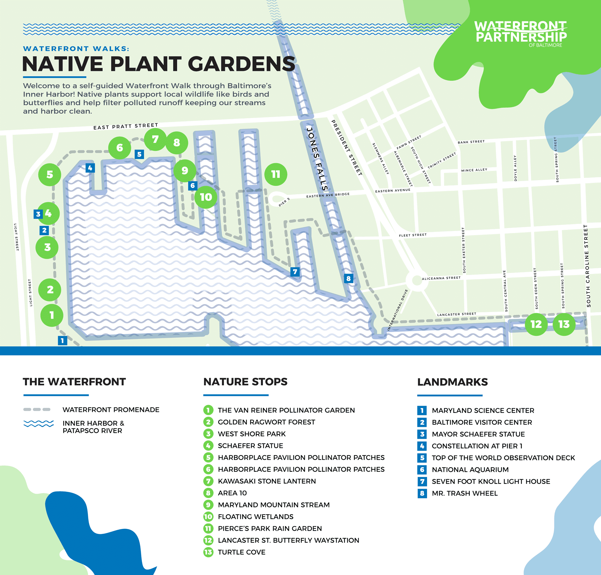Baltimore’s Waterfront Partnership has put together a walking map showcasing the many native plant gardens installed along the harbor. The full map is available online, along with information about why native plants are an important tool keeping the harbor healthy.